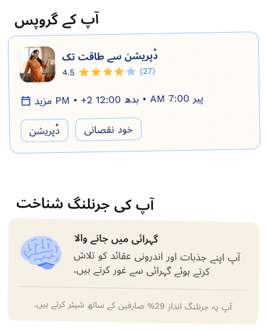 باہمی تعاون اور مشترکہ ترقی کے لیے ڈیزائن کردہ تھراپسٹ کی زیرقیادت ویڈیو سیشنز میں ساتھیوں سے جڑیں۔ رہنمائی شدہ بات چیت میں حصہ لیں، محفوظ طریقے سے تجربات کا اشتراک کریں، اور اسی طرح کے سفر پر دوسروں کے ساتھ بامعنی روابط استوار کریں۔